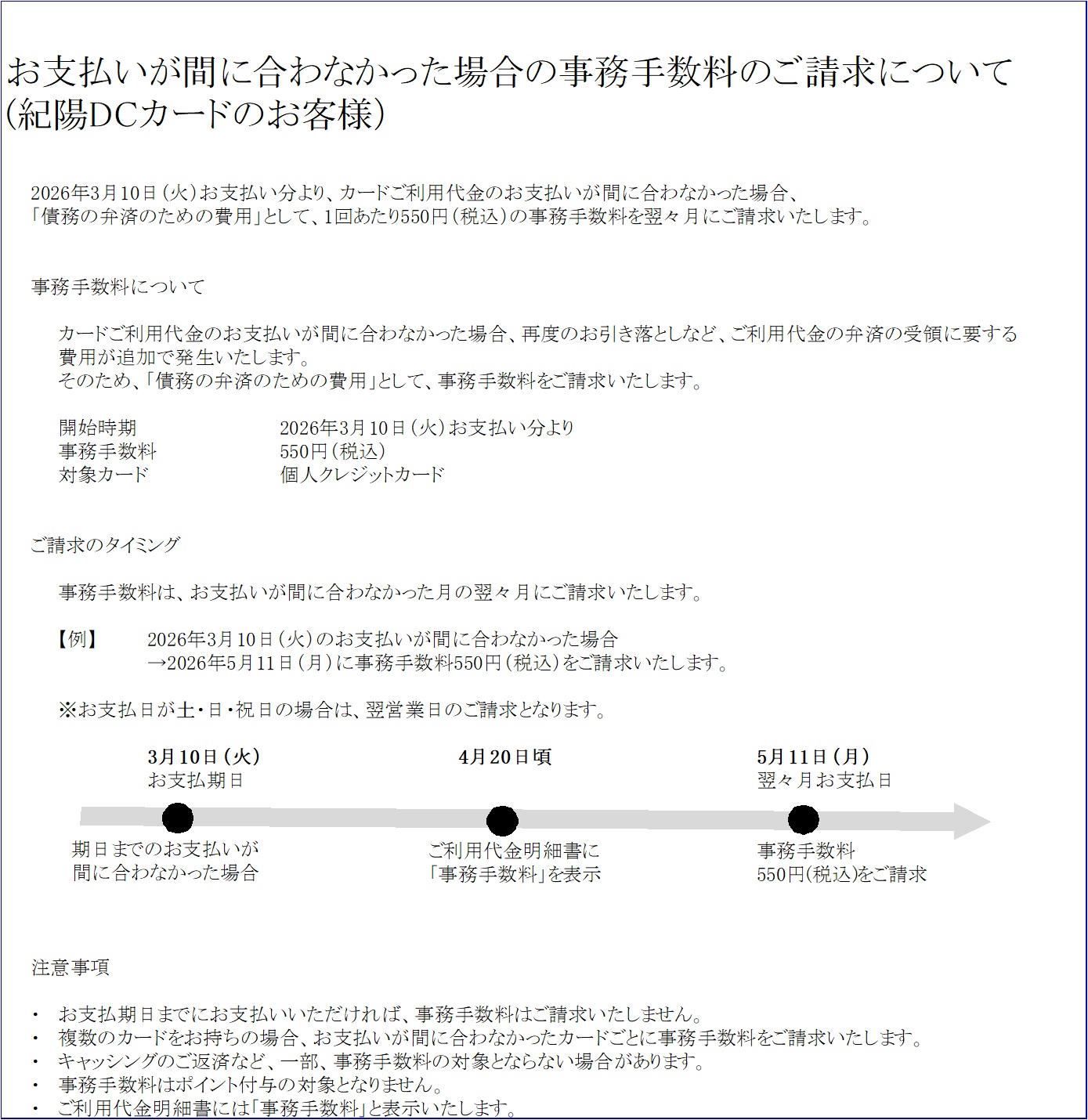 お支払いが間に合わなかった場合の「事務手数料」のご請求について(紀陽DCカードのお客様)